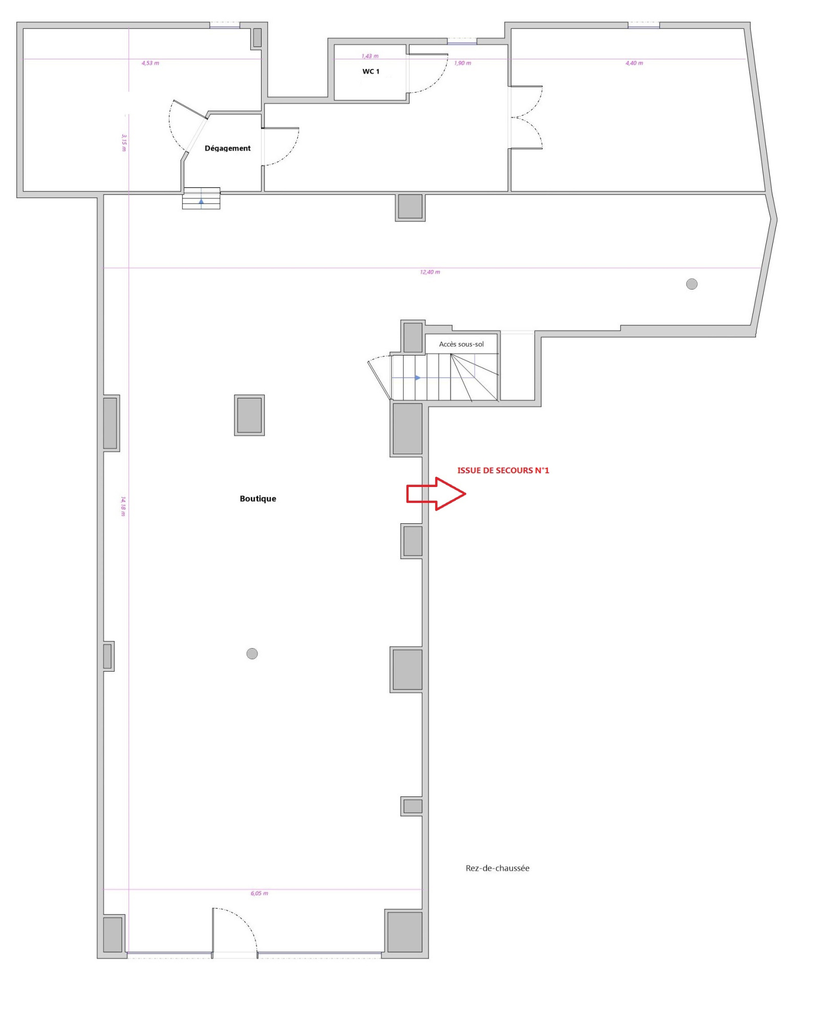 Le RDC, d'une superficie de près de 140m², composé d'un open space de près de 100m², d'une arrière-boutique de 40m² avec sanitaires et d'un droit exterieur de 10m², d'un bel escalier menant au sous sol et d'une issue de secours.