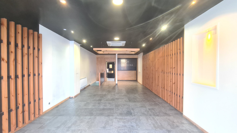 61m² au RDC composé d'un bel espace commercial et laboratoire arrière, un escalier amenant au sous-sol de 25m² (pondéré à moitié) avec 2 sanitaires et réserves.