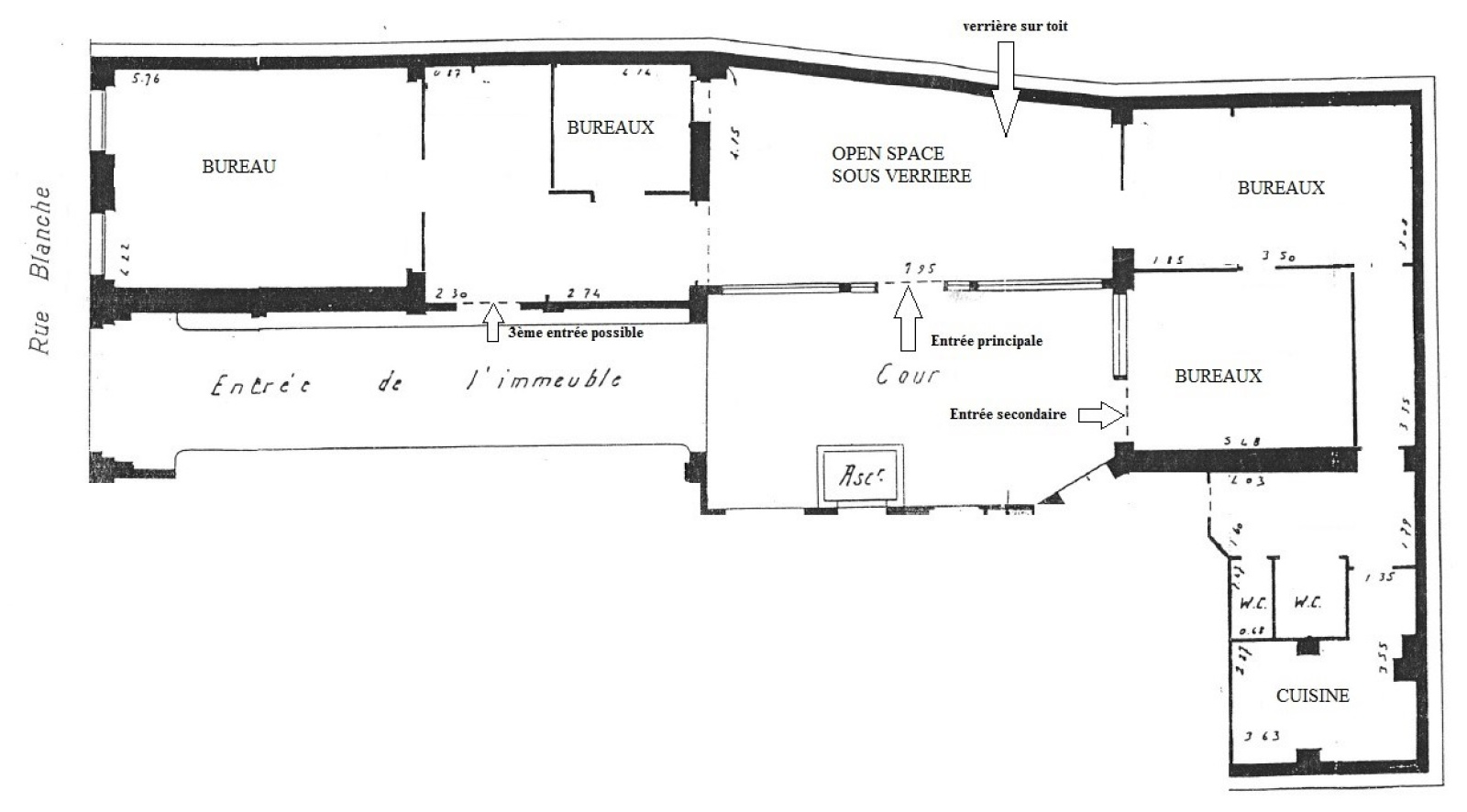 Surface de bureaux de 137 m² en RDC sur rue et cour. Ils se composent d'une entrée avec un open space, de 4 bureaux, d'une cuisine, de 2 sanitaires.