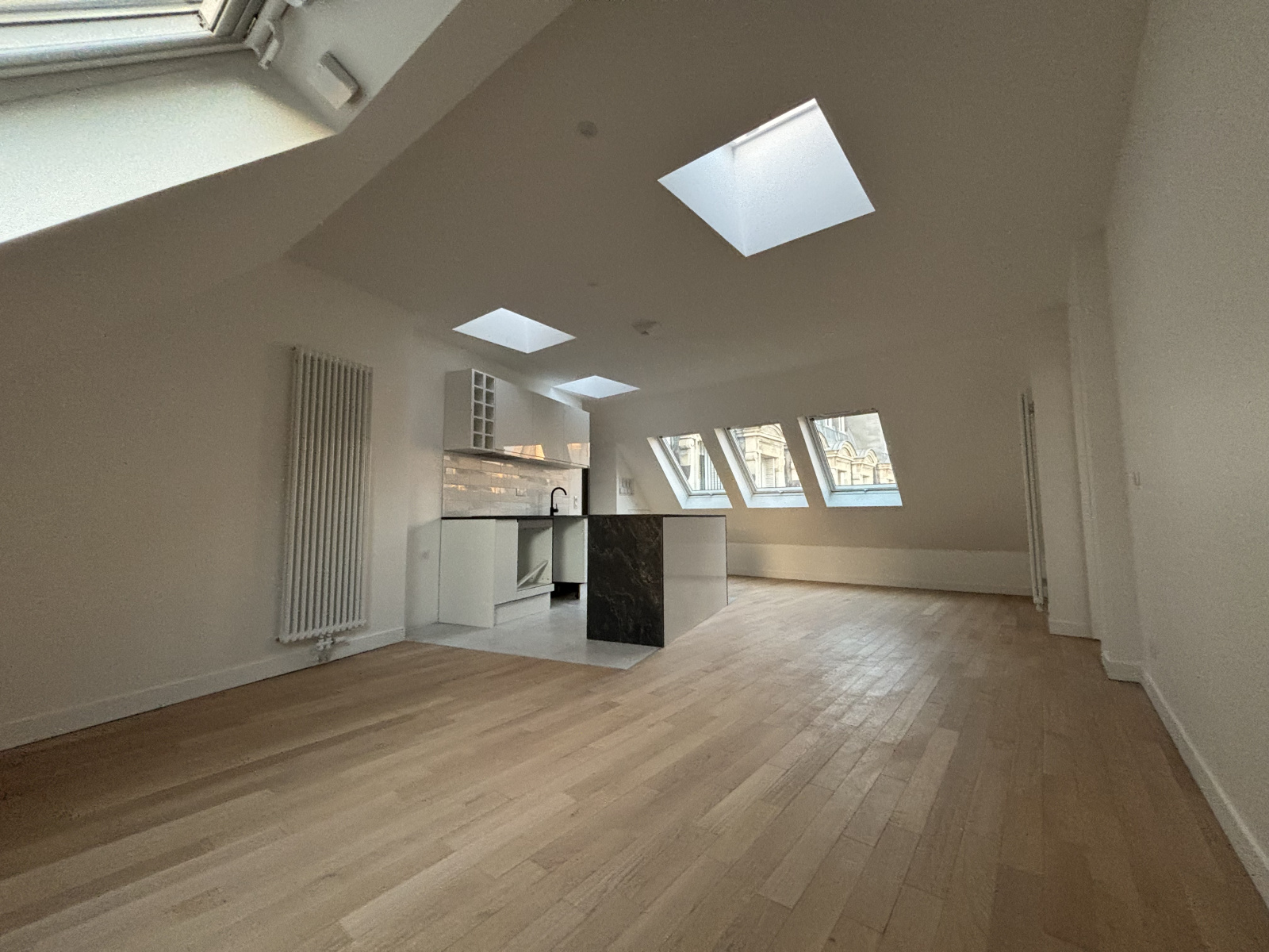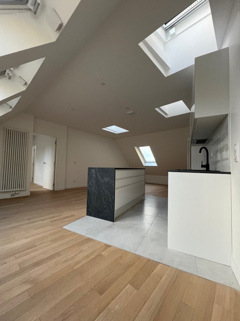 AXIMMO vous propose un spacieux et lumineux appartement mansardé de 3 pièces avec 98.85 m² de surface au sol . Il se compose d’une entrée, d’un petit bureau, d’un WC séparé, d’un séjour avec cuisine ouverte, de 2 chambres avec de nombreux rangements intégrés, d’un grand dégagement avec placards bas, ainsi que d’une salle de bains avec WC. L’appartement bénéficie d’une exposition est-ouest, offrant une belle luminosité naturelle grâce à ses nombreuses fenêtres/velux. L’immeuble dispose d’une gardienne. Digicodes.