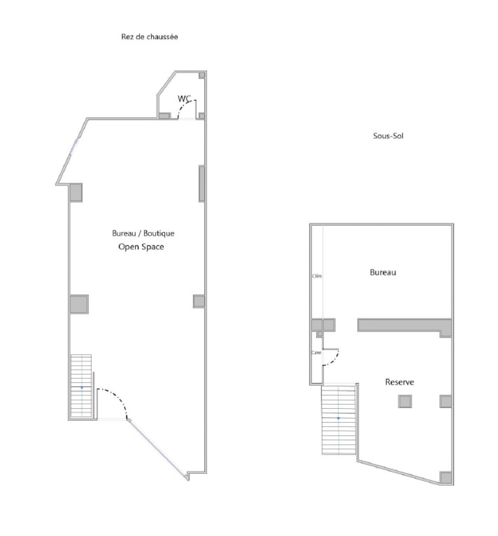 Espace de 32 m², divisé en une cave, une réserve et un bureau, idéal pour le stockage ou pour aménager un espace de travail supplémentaire.